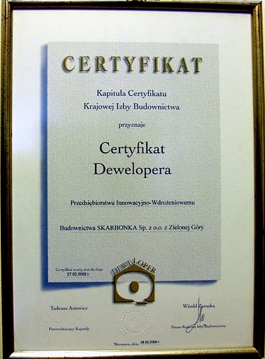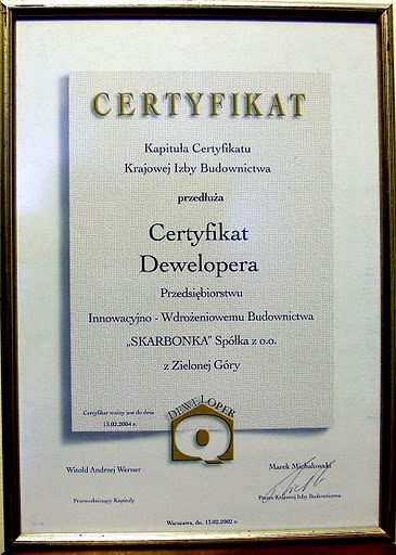 Stawiane firmom wymagania regulaminowe sprawiają, że tylko nieliczni deweloperzy przystępują do procesu certyfikacyjnego, a o tych którzy przechodzą z wynikiem pozytywnym wnikliwe badania, tak jak nasze przedsiębiorstwo, można śmiało powiedzieć, że są wiarygodne i zasługują na miano tych najlepszych, godnych rekomendacji Polskiego Związku Pracodawców Budownictwa.
