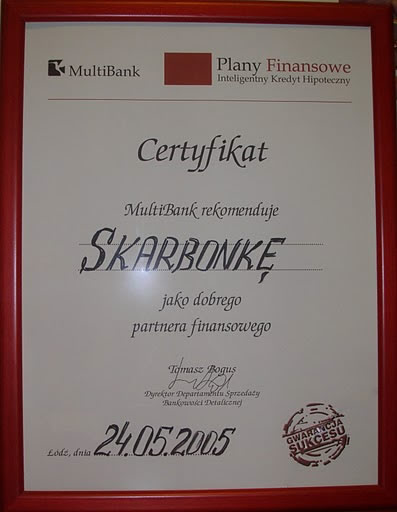 Dnia 24.05.2005 r. Dyrektor Departamentu Sprzedaży Bankowości Detalicznej MultiBanku przeznał Spółce certyfikat rekomendacji dla dobrego partnera finansowego.